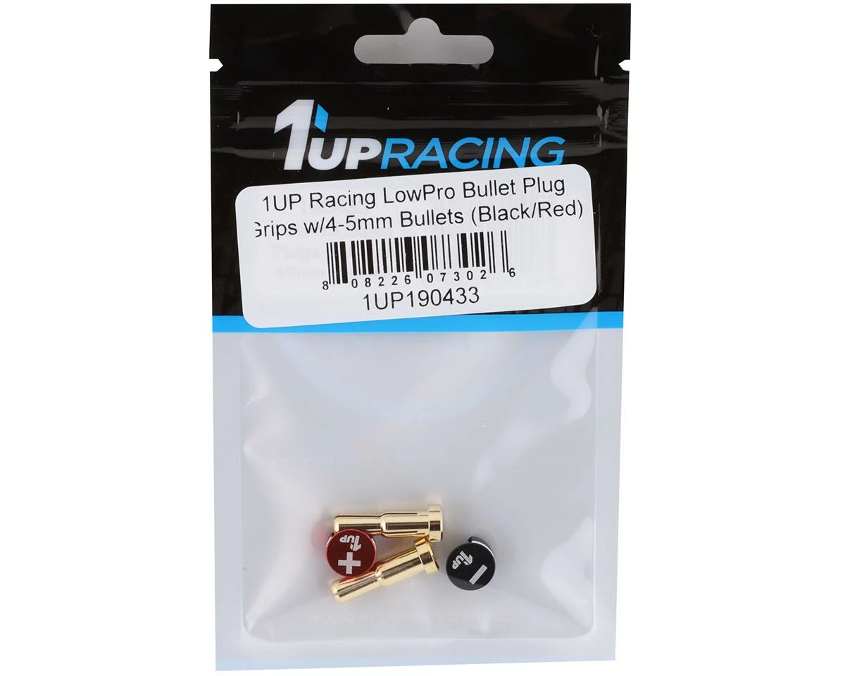 1UP Racing 4-5mm LowPro Bullet Plugs with Bullet Grips. These are perfectly paired to add to any charge lead where you need 4mm or 5mm bullets. Included with these are the LowPro Bullet Plug Grips. These are a great way to quickly identify your positive and negative leads.