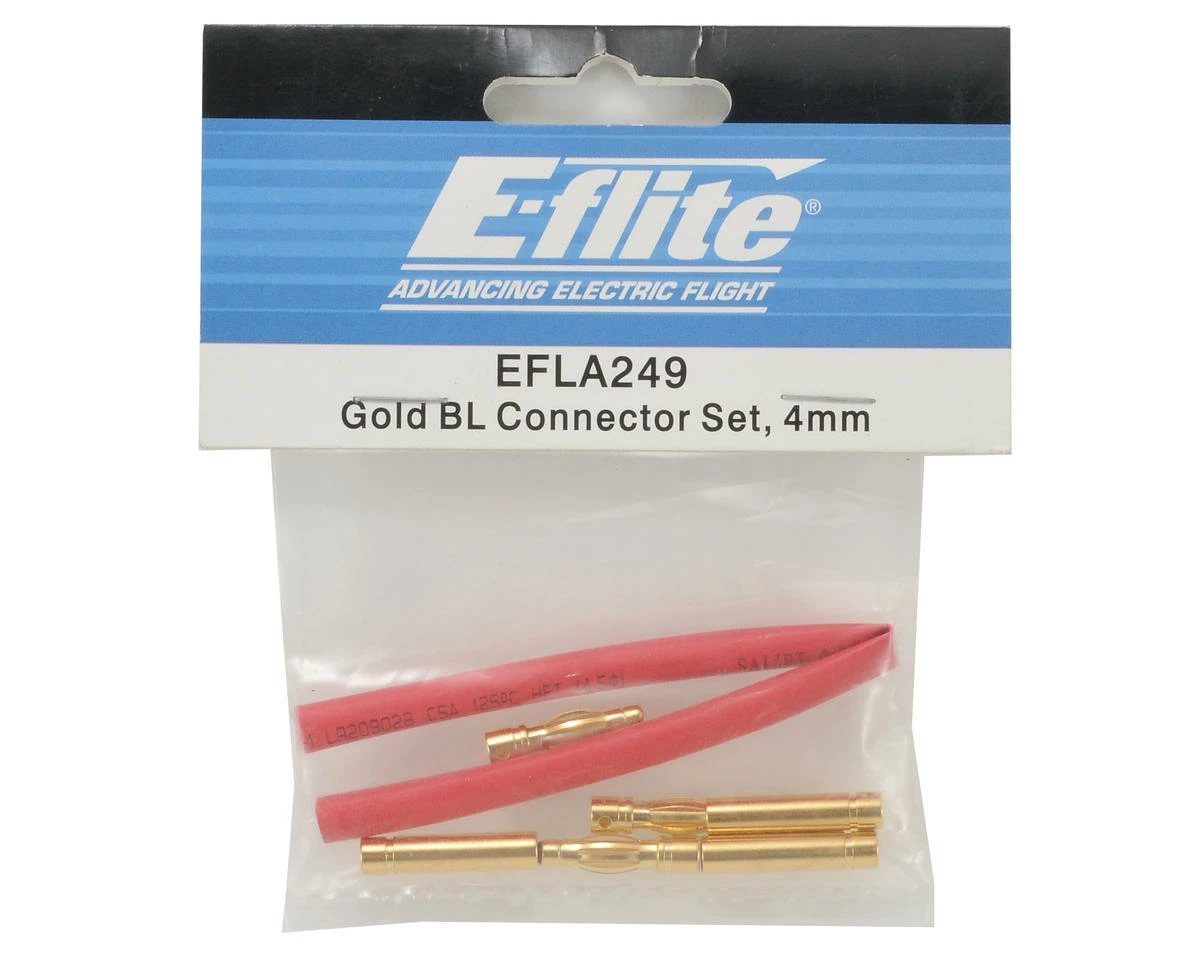 This is a E-flite 4mm Gold Bullet Connector Set. This set includes three male 4mm connectors and three female 4mm connectors, as well as a length of heat shrink tubing.
