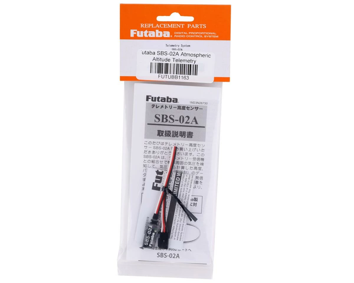 Futaba SBS-02A Atmospheric Altitude Telemetry Sensor. This sensor uses a built in vario meter to measure atmospheric pressure to calculate your models given altitude. Featuring a small lightweight design, this sensor would be perfect for gliders and other models where space is limited. Package includes one altitude sensor and one manual.