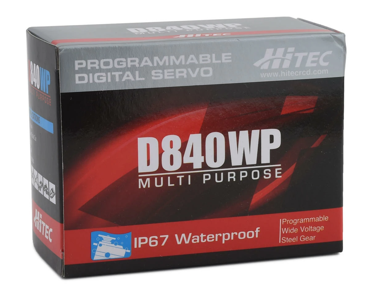 This is a Hitec High Voltage D840WP Waterproof High Speed Steel Gear Servo, designed using Hitec’s redesigned, cutting edge, custom engineering. Combining industry leading high-resolution, state-of-the-art ultra-response technology with a 32-bit MCU and 12-bit ADC for unprecedented programmability and flexibility, these servos deliver significantly smoother movement. The speedy, powerful line operates on a wide 4.8 ~ 8.4 voltage range, allowing use with any common battery chemistry without the need for adapters or regulators. Featuring Hitec’s 15 tooth HD output spline with 3mm hex screw, each D-Series servo brings monster performance never known before in the market.