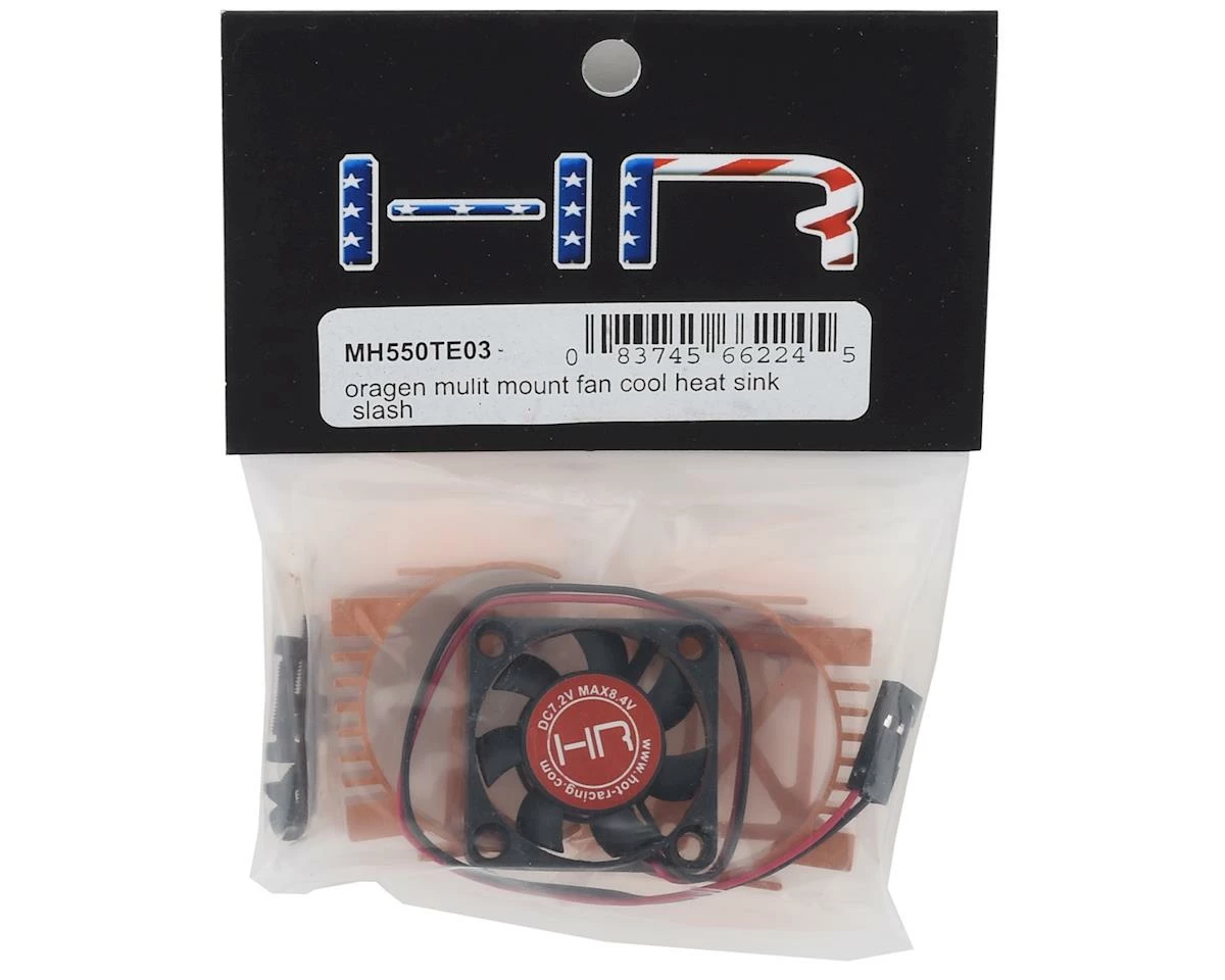 This is a Hot Racing Clip-On Two-Piece Motor Heat Sink with Fan, a universal clip on motor heat sink and fan for use on 540 and 550 size motors. Versatile two-piece heat sink clip provides eight different width adjustments.