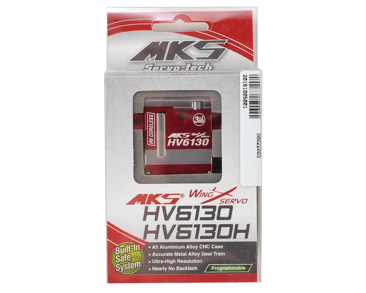 This is the MKS DS6130 Metal Gear High Torque Glider Wing Servo. This servo features a full aluminum case that provides efficient heat dissipation and a metal alloy gear train for durability. Operating between 6V-8.4V, the 6130 series offers unparalleled performance within it’s class. Plus, with all that metal, you would expect this servo to be on the heavy side, but at a scant 23 grams, this servo is feather light when compared to other servos with similar features making it an ideal choice for a glider wing servo applications when precision, durability and speed are required.