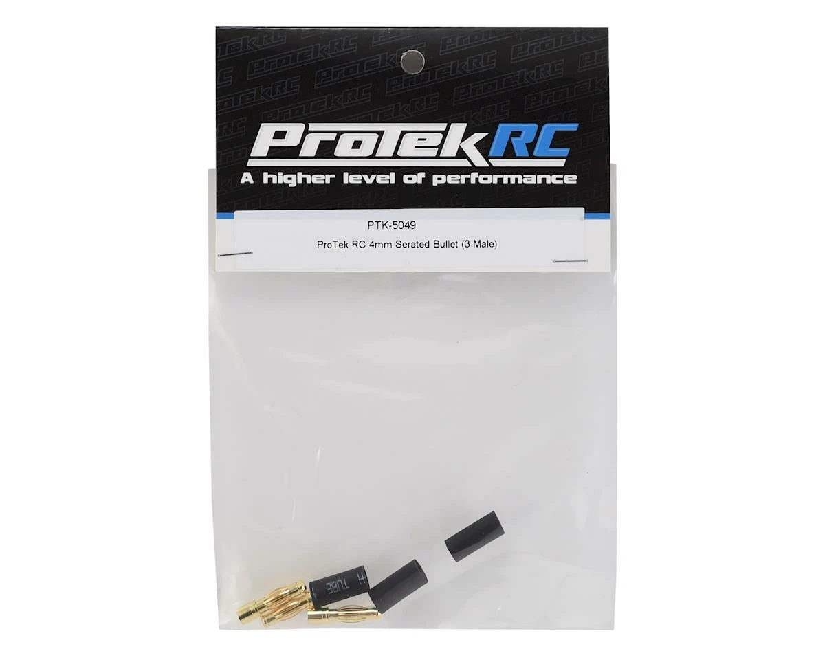 ProTek R/C 4mm Serrated Male Bullets are great for a variety of applications! These are great for battery connectors or motor to speed control connectors. Package includes three bullets and heat shrink tubing.