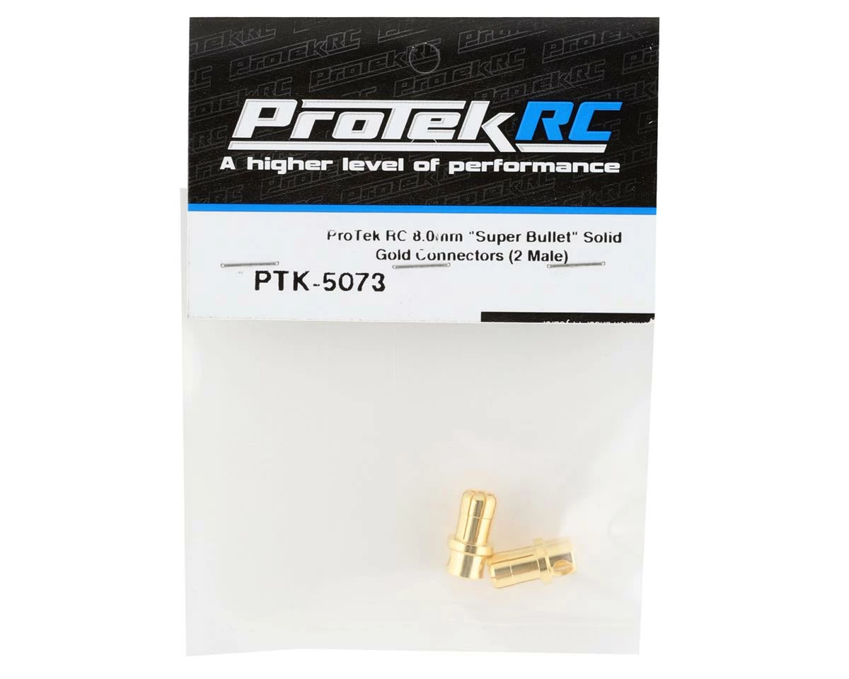 The ProTek RC 8.0mm “Super Bullet” Solid Gold Connectors. The ProTek R/C “Super Bullet” Solid Gold Connectors are an absolute must for high current / high voltage applications! With lower resistance than a typical T-style plug and traditional spring-type bullet connectors, they are the standard for brushless applications. Package includes two bullet connectors.