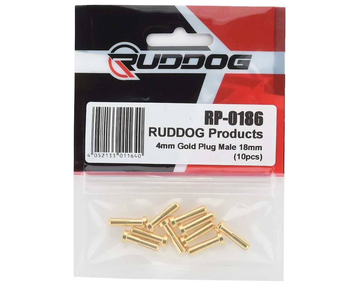This is a pack of ten Ruddog 4mm Gold Bullet Plugs. These male plugs are 4mm diameter and 18mm long.