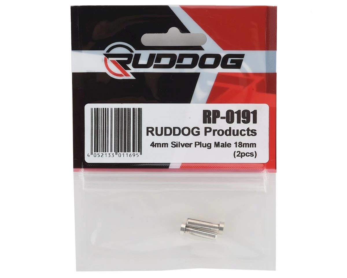 This is a pack of two Ruddog 4mm Silver Bullet Plugs. These male plugs are 4mm diameter and 18mm long.