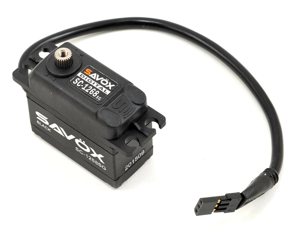 Savox’s SC-1268SG Black Edition Standard “High Torque” Digital Steel Gear High Voltage Servo features a sleek black aluminum center case with laser etched details, as well as a shorter 200mm long heavy duty wire. These servos combine leading edge technology with super high 12 bit (4096) resolution. These servos also feature a redesigned motor/controller unit, and use a ‘bullet proof’ all steel gear set for unmatched strength that makes them ideal for 1/8 nitro cars, as well as large scale airplanes and 600-700 class heli swashplate applications that require a high torque servo.