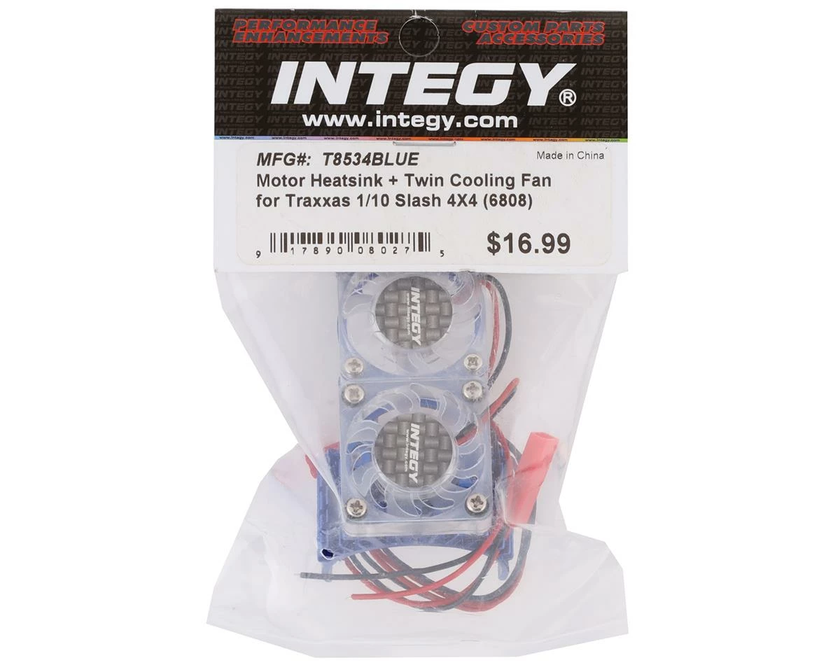 The Team Integy Slash 4X4 Motor Heatsink with Twin Fan is a great option part for those looking to keep the electronics in the Traxxas Slash 4×4 cooler. The motor heatsink will work for on a 550 or 540 size motor and features a nice blue anodized finish. The Cooling fan is powered through a JST style connector. Package includes one heatsink with two fans.
